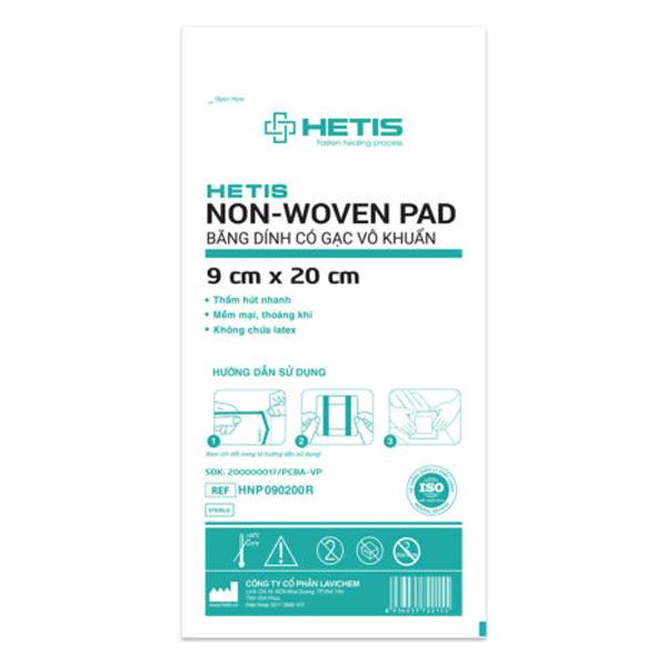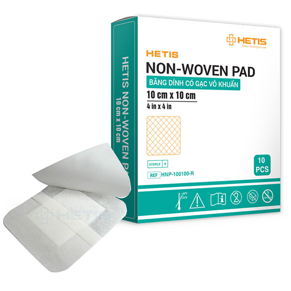 Hetis Non-Woven Pad là băng dính có gạc vô khuẩn cấu tạo gồm phần vải không dệt phủ keo acrylic và phần gạc cotton phủ lớp PE, thấm hút ở giữa.