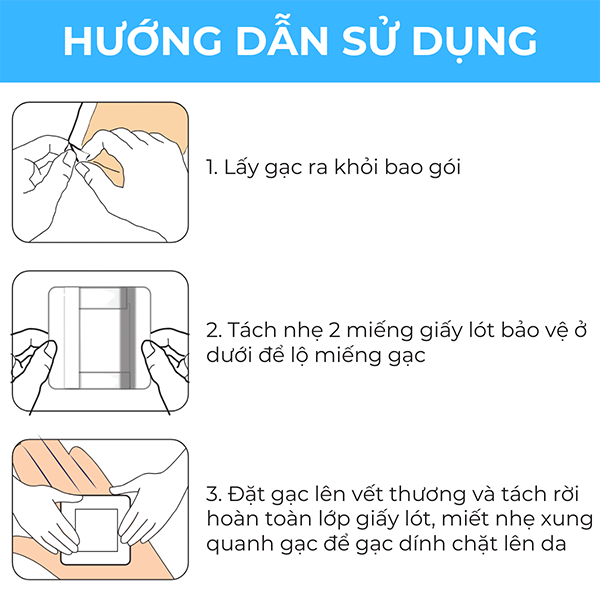 • Lấy gạc ra khỏi bao gói, tách nhẹ hai mép giấy lót ra hai bên để lộ miếng gạc, đặt gạc lên vết thương. Tách rời hoàn toàn lớp giấy lót, vuốt nhẹ gạc từ trong ra ngoài để gạc dính chặt lên da.